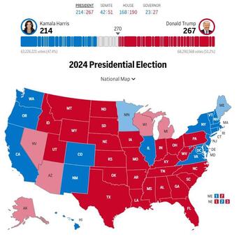 特朗普仅差3票就能赢了G买球网体育信息,但哈里斯距离270票还差不少!现在两边的大比分来到了214:267!基本依然不错提前文书,特朗普获得大选重返白宫了!