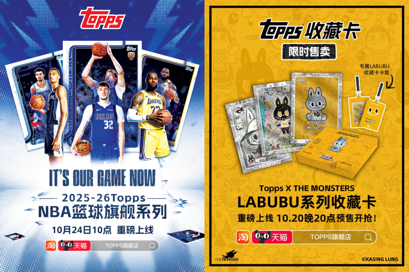 (图说:Topps天猫官方旗舰店首发的NBA篮球旗舰系列与Topps X THE MONSTERS / LABUBU拉布布Chrome系列保藏卡)背负裁剪:韩璐(EN053)体育集锦
