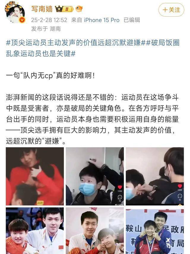 2月28日,某体坛大V就谈到了国乒饭圈磕CP乱象,锋芒直指国乒鼓胀顶流王楚钦孙颖莎,该大V感触说念:让(孙颖莎王楚钦)说一句“队内无cp”真的好难啊!