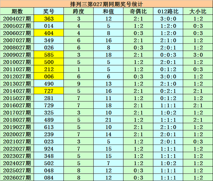 上期回来:摆列三第2026027期奖号为084,组选类型为组六,奖号大小比为1:2,012路比为1:1:1,奇偶比为0:3。
