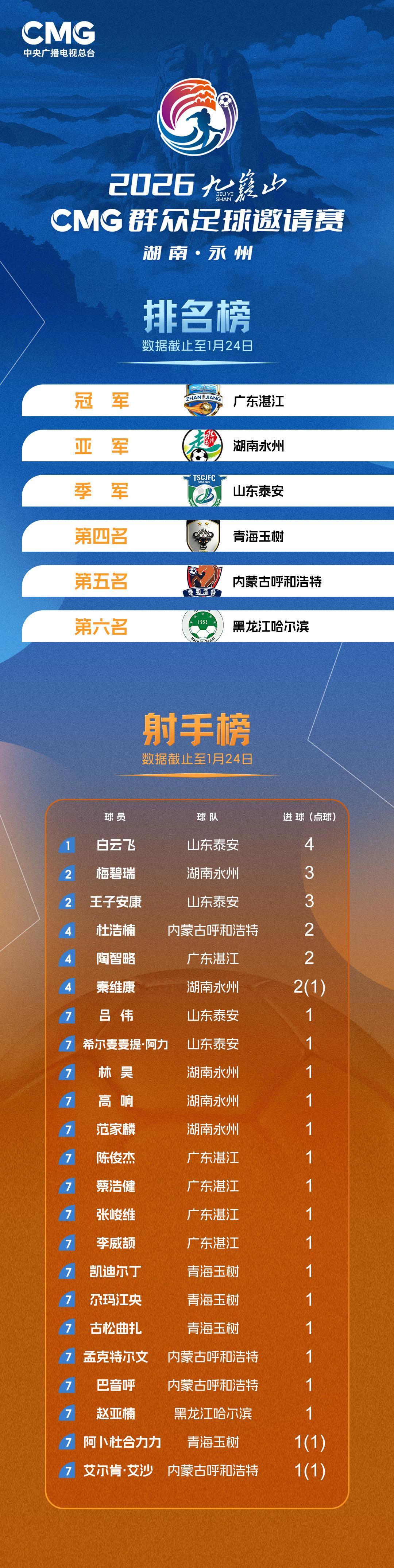 1月24日体育赛事直播,首届CMG公共足球邀请赛决赛,湖南永州队对阵广东湛江队。